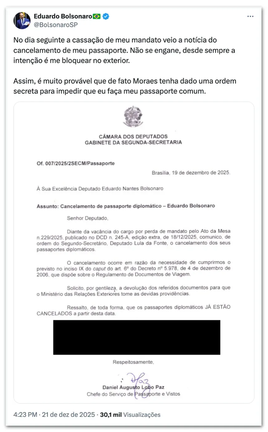 O ex-deputado Eduardo Bolsonaro afirmou que o cancelamento do seu passaporte diplomático, ocorrido após a cassação de seu mandato pela Câmara, tem como objetivo bloqueá-lo no exterior. Ele ressaltou que o documento é concedido a todos os congressistas e é perdido automaticamente quando o mandato se encerra.