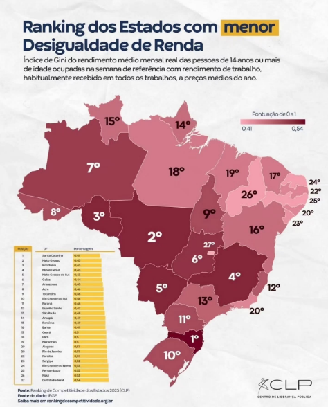 Dados do Ranking de Competitividade dos Estados 2025, elaborados pelo Centro de Liderança Pública (CLP) com base em indicadores do IBGE, revelam que Mato Grosso é o segundo estado com a menor desigualdade de renda do Brasil. Com um Índice de Gini de 0,43, o estado fica atrás apenas de Santa Catarina (0,41).